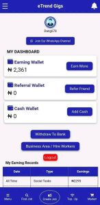 To boost your earnings, you have the referral option. With referrals, earning on this platform is way better. When you start to refer your friends and families to sign up and also earn, you will be given rewards for every new referral you get. Unlike the tasks that will earn you five naira or less per job, earning by referral will earn you up to five hundred naira. With more referrals, you can earn thousands in a short amount of time. So, if you are looking to earn a lot from etrend gigs platform, the referral method is your best bet.